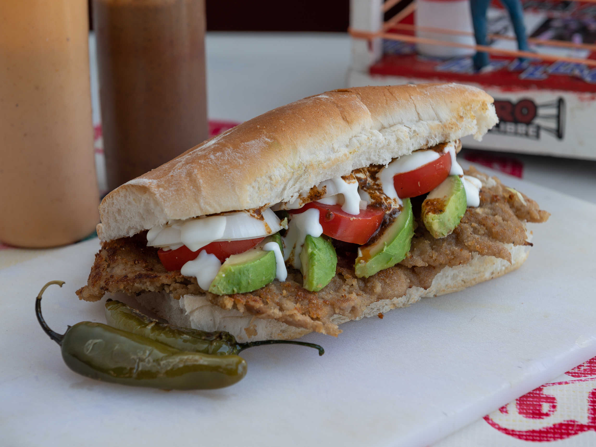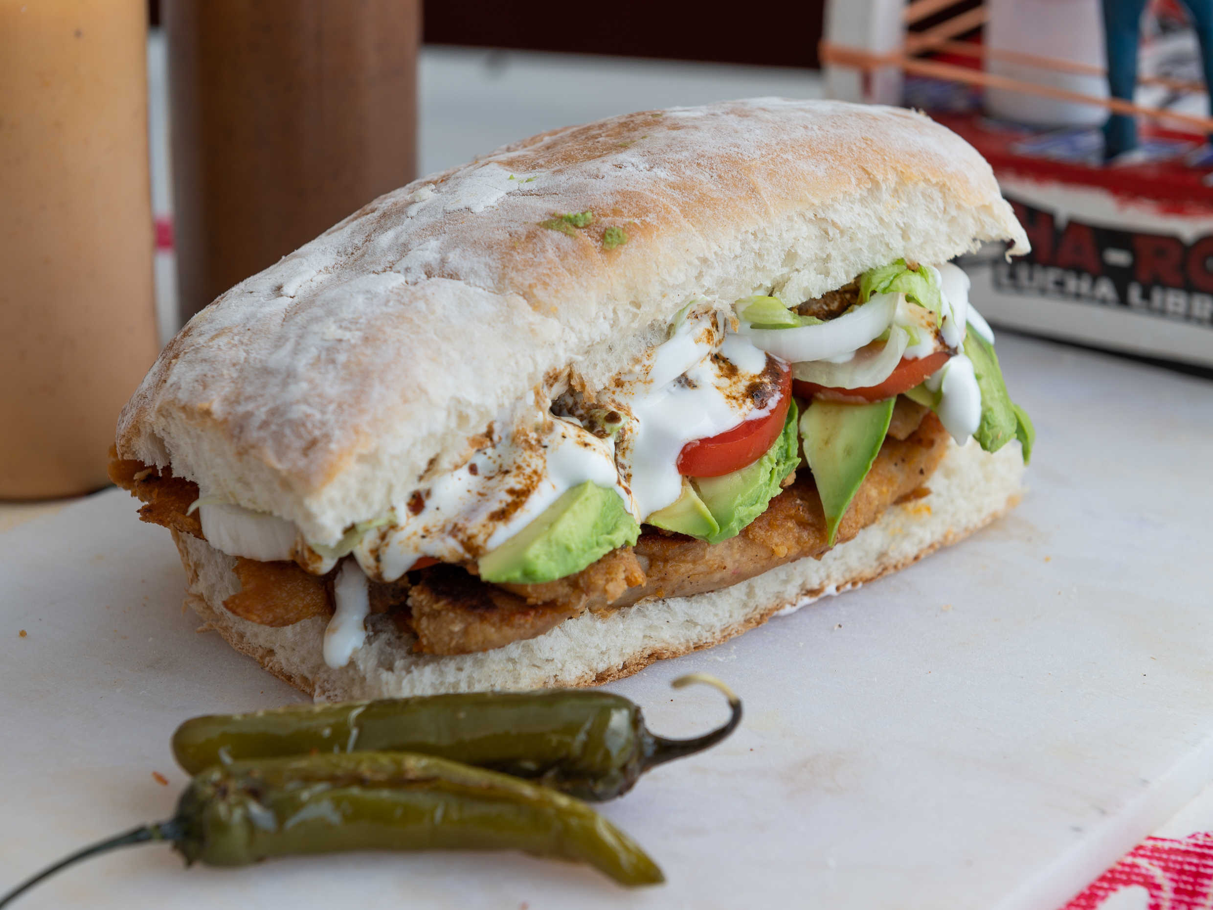 Pan telera, pierna cocida, frijolitos, queso chihuahua, jamón, lechuga, tomate, aguacate, cebolla, aderezo, crema y salsa de la casa.