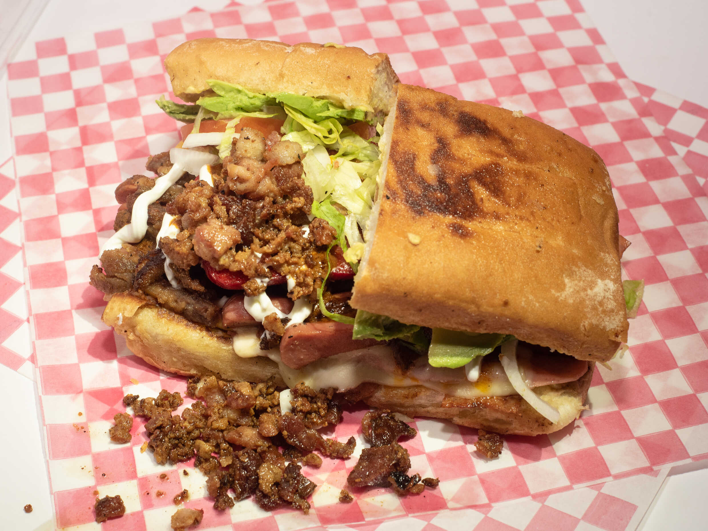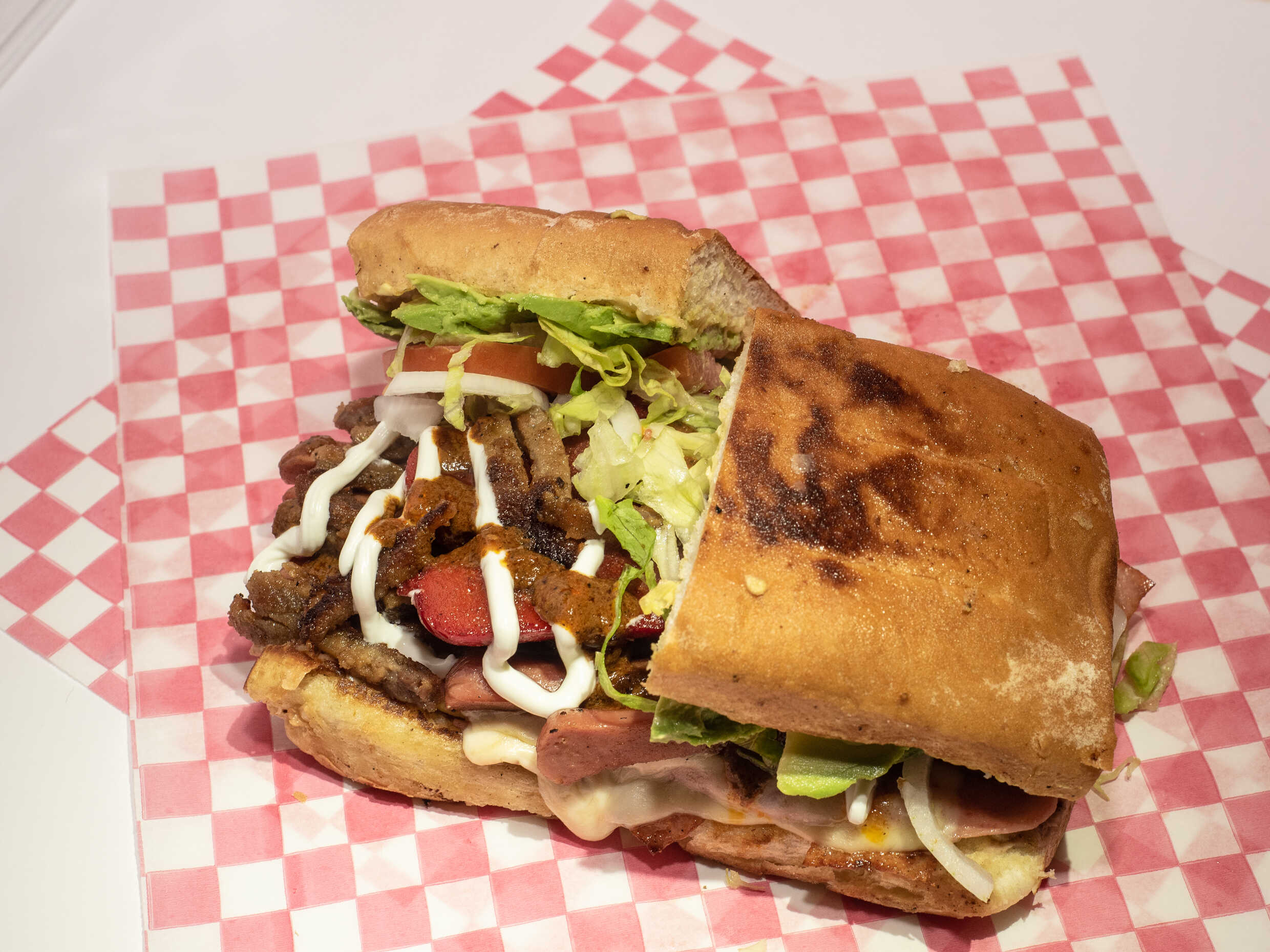 Pan telera, frijolitos, salchicha, salchicha dorada, milanesa de res, doble huevo en omelet, queso chihuahua, mantequilla, crema, jamón, lechuga, tomate, aguacate, cebolla, aderezo, salsa de la casa, salchicha para asar, tocino, piña, quesillo oaxaca y champiñones.