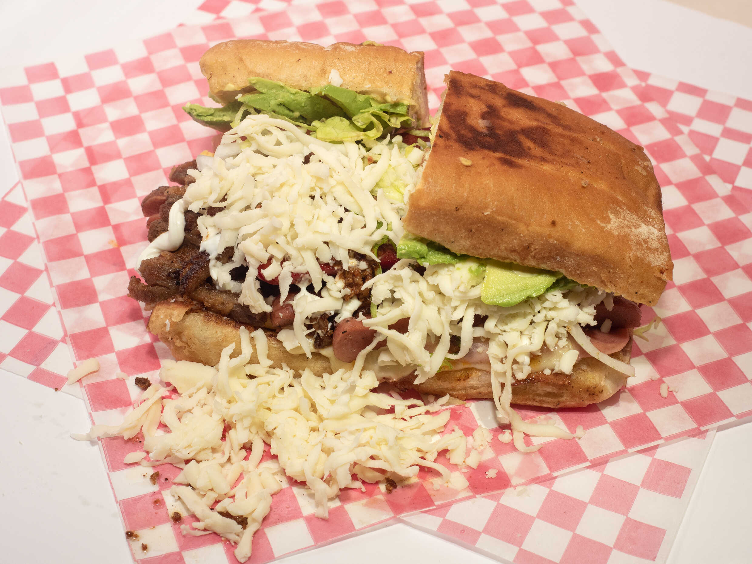 Pan telera, frijolitos, carnes frías, queso chihuahua, jamón, lechuga, tomate, aguacate, cebolla, aderezo y salsa de la casa.