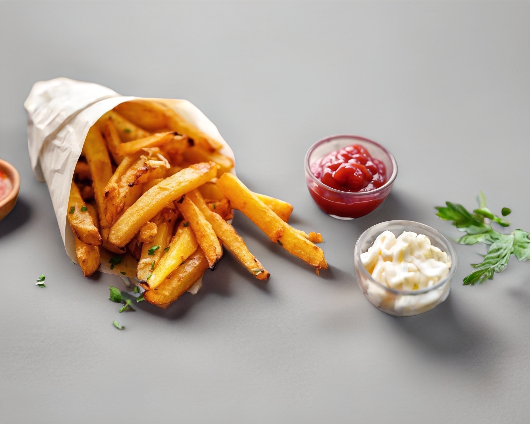 porción de papas a la francesa de 100 gramos, incluye salsa catsup