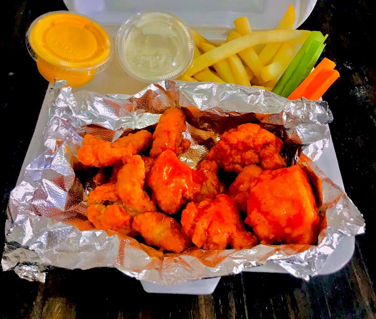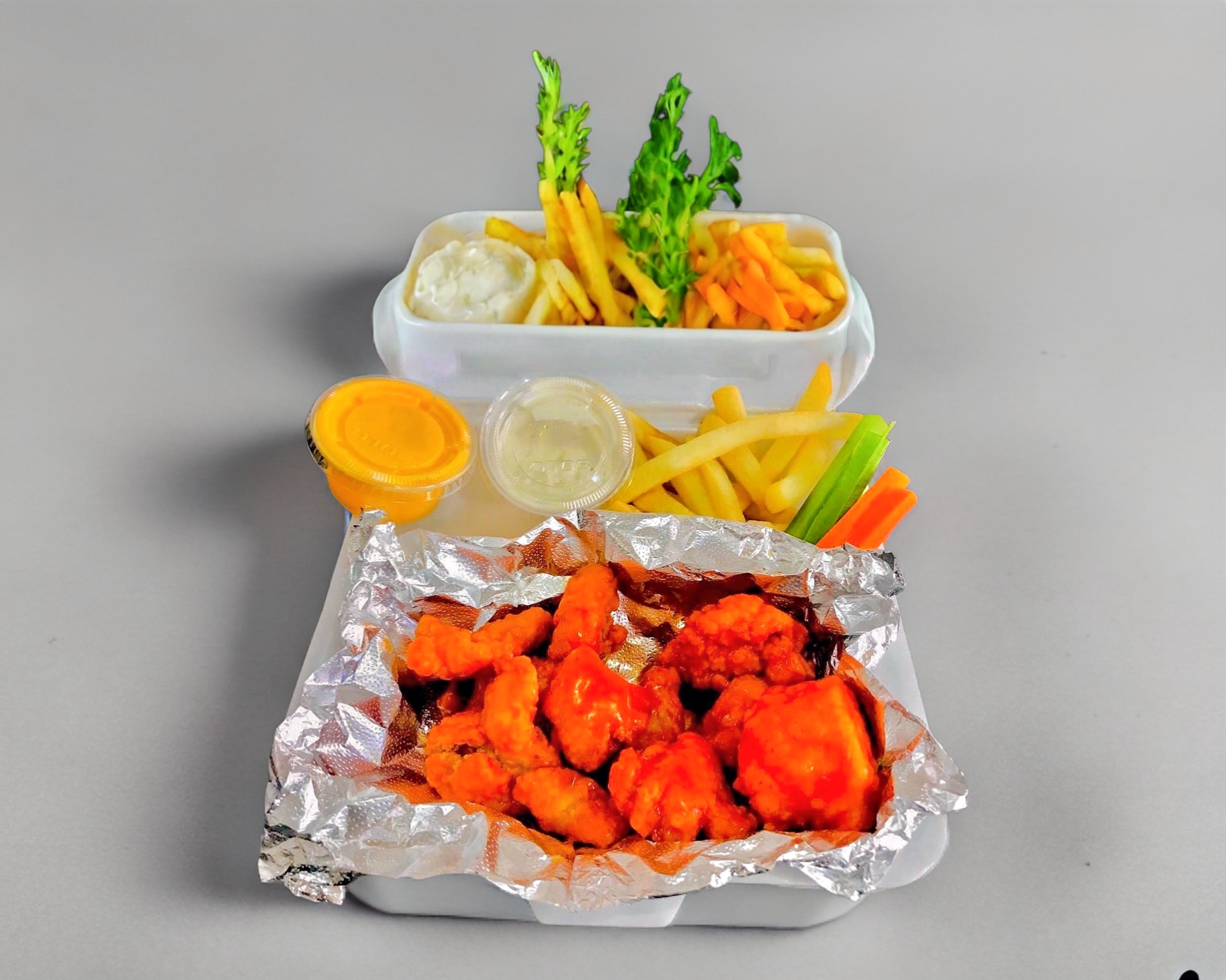 Deliciosos boneles de pechuga de pollo bañados en tu salsa favorita acompañados de papas a la francesa,aderezo y verduras