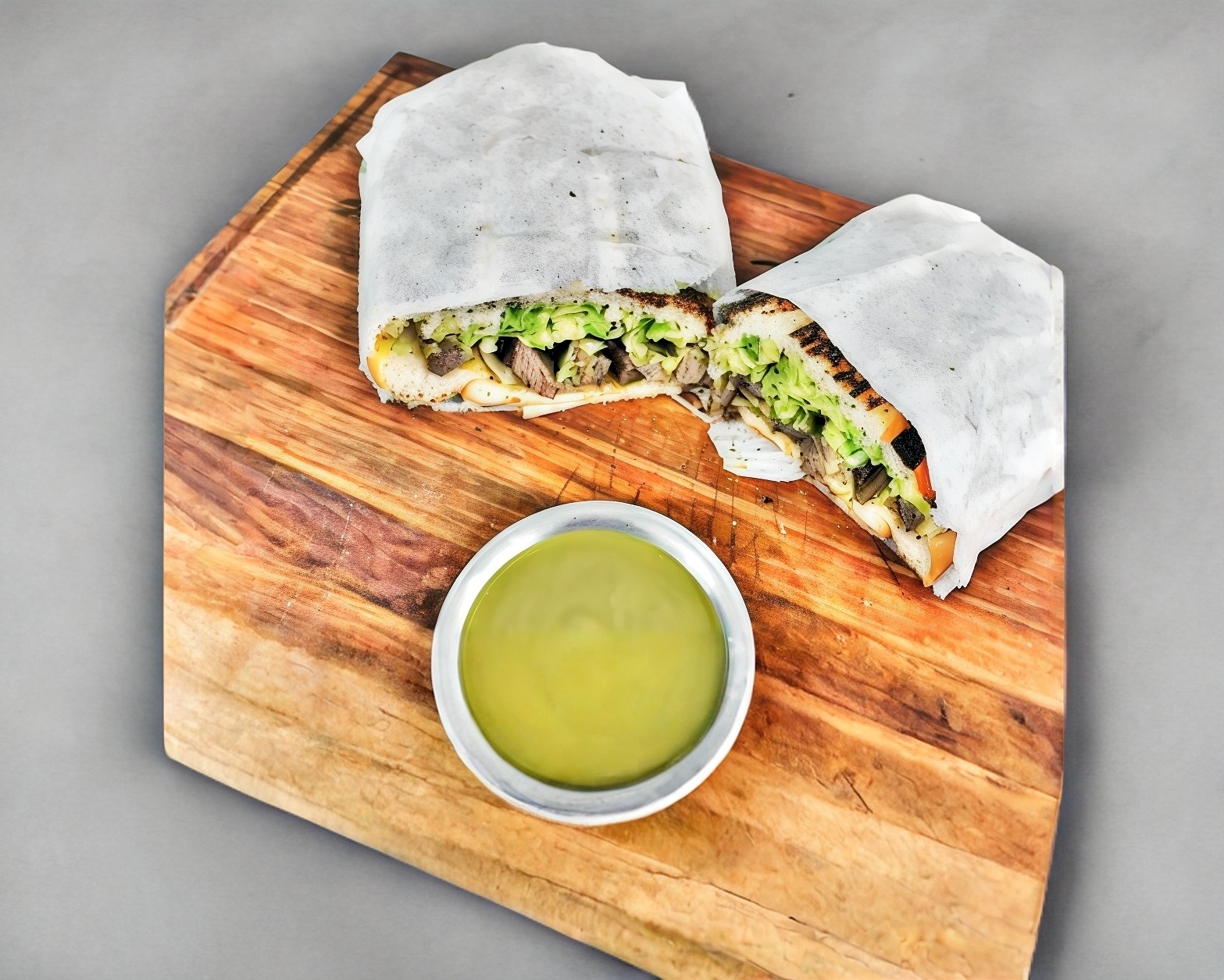 Carne asada de 120gr con aguacate y queso derretido.