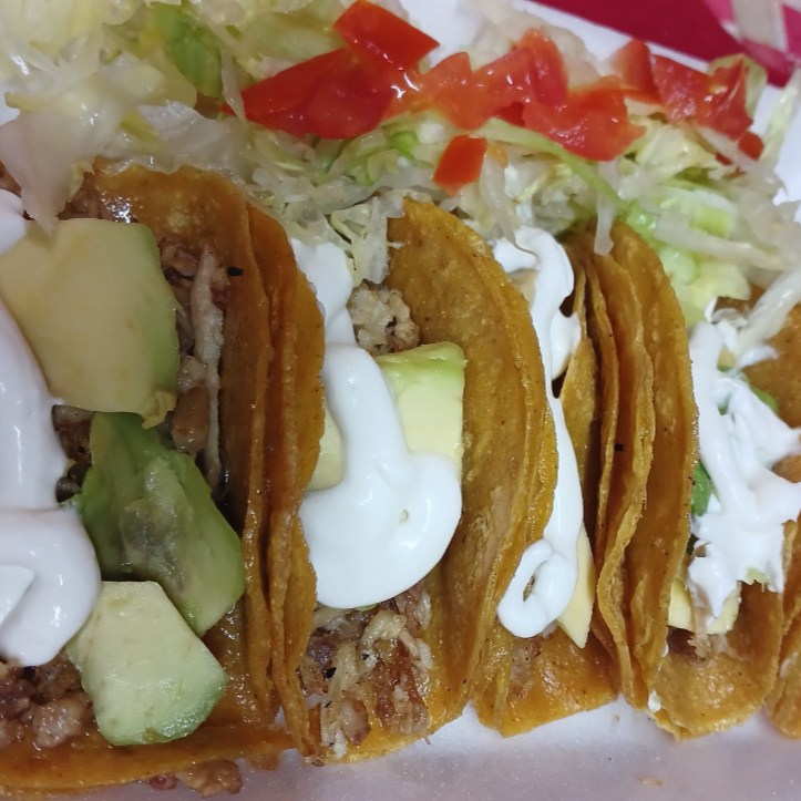 TORTILLA DE MAIZ CON CARNE DE PUERCO , AGUACTE ,CREMA , COMPLEMENTO LECHUGA Y TOMATE