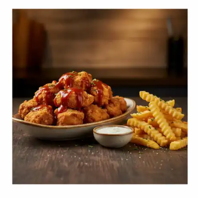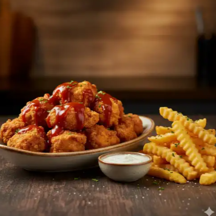 Boneless (250 g) con papas a la francesa, aderezo ranch, búfalo, BBQ. mango habanero, pikin limón.