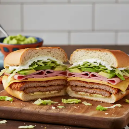 Hamburguesa de carne de res con lechuga, aguacate, salchicha, queso y jamón.
