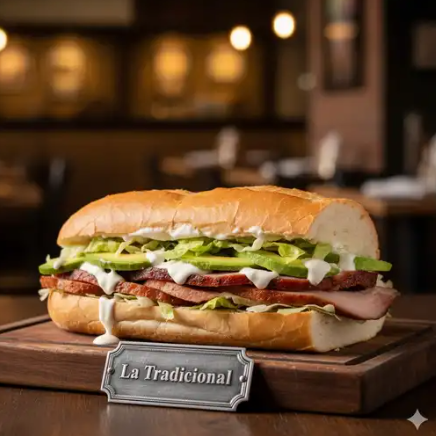 Torta con carne de puerco, lechuga, aguacate, crema, jamón y queso.