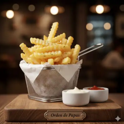 Porción de papas fritas crujientes, acompañadas de salsa cátsup.