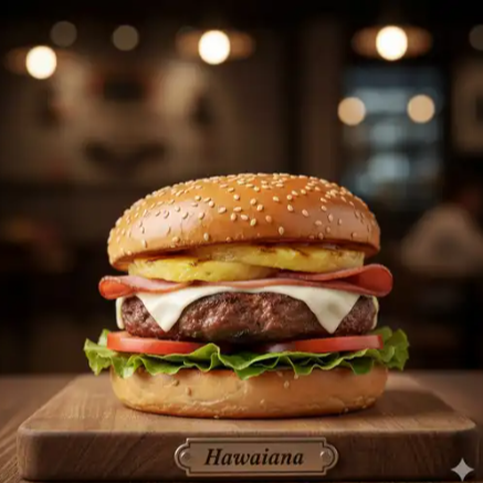 Hamburguesa de carne de res con jamón, queso piña, lechuga y aguacate.