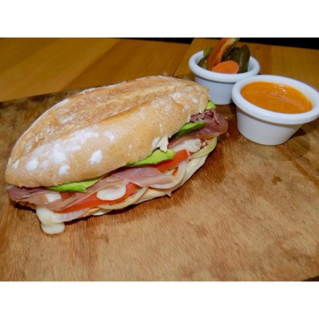 Torta de Jamón Serrano , Queso Chihuahua , Aguacate , Cebolla Asada y Tomate Asado