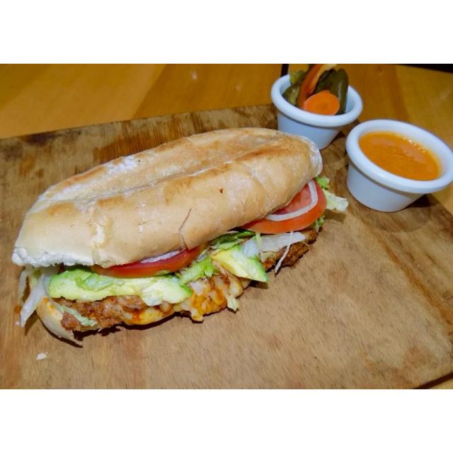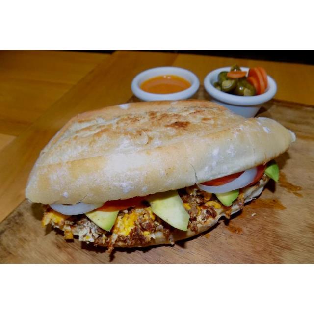 Torta de Chorizo de puerco con Queso Oaxaca, Aguacate, Tomate, Lechuga y Cebolla.