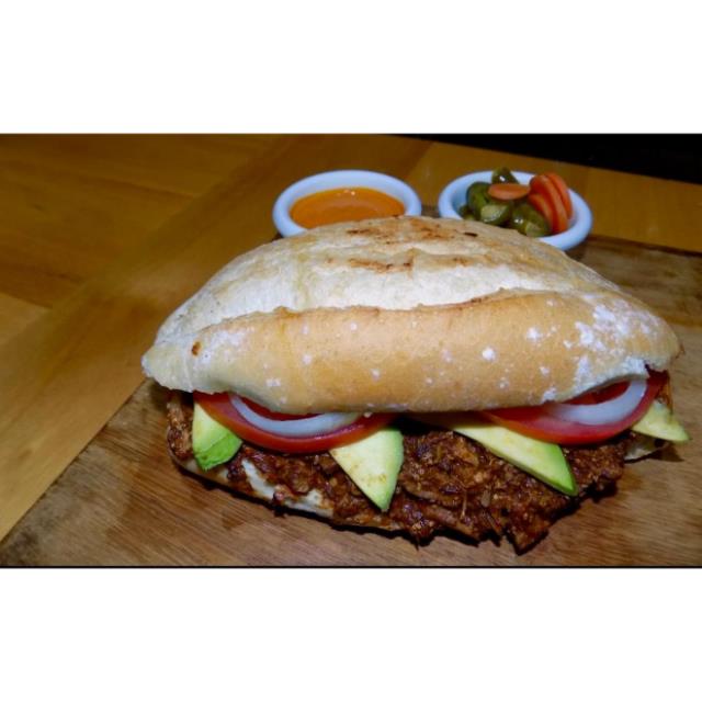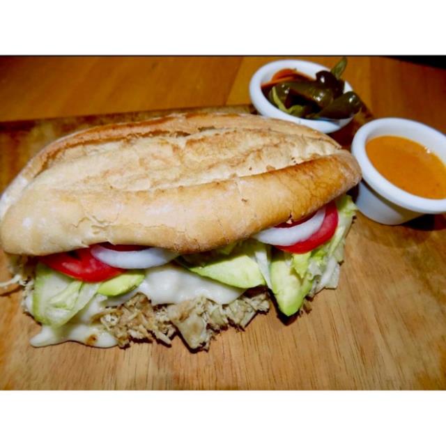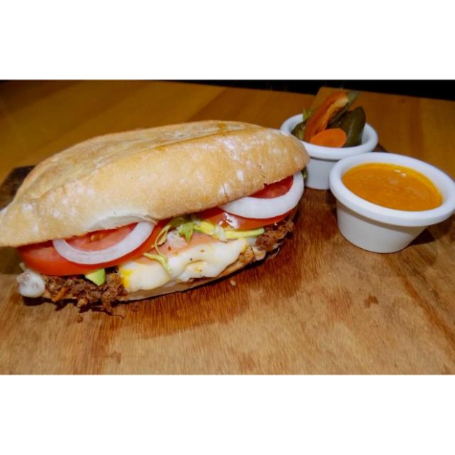 Torta de Pierna de Puerco , Queso Oaxaca , Aguacate , Tomate , Lechuga y Cebolla