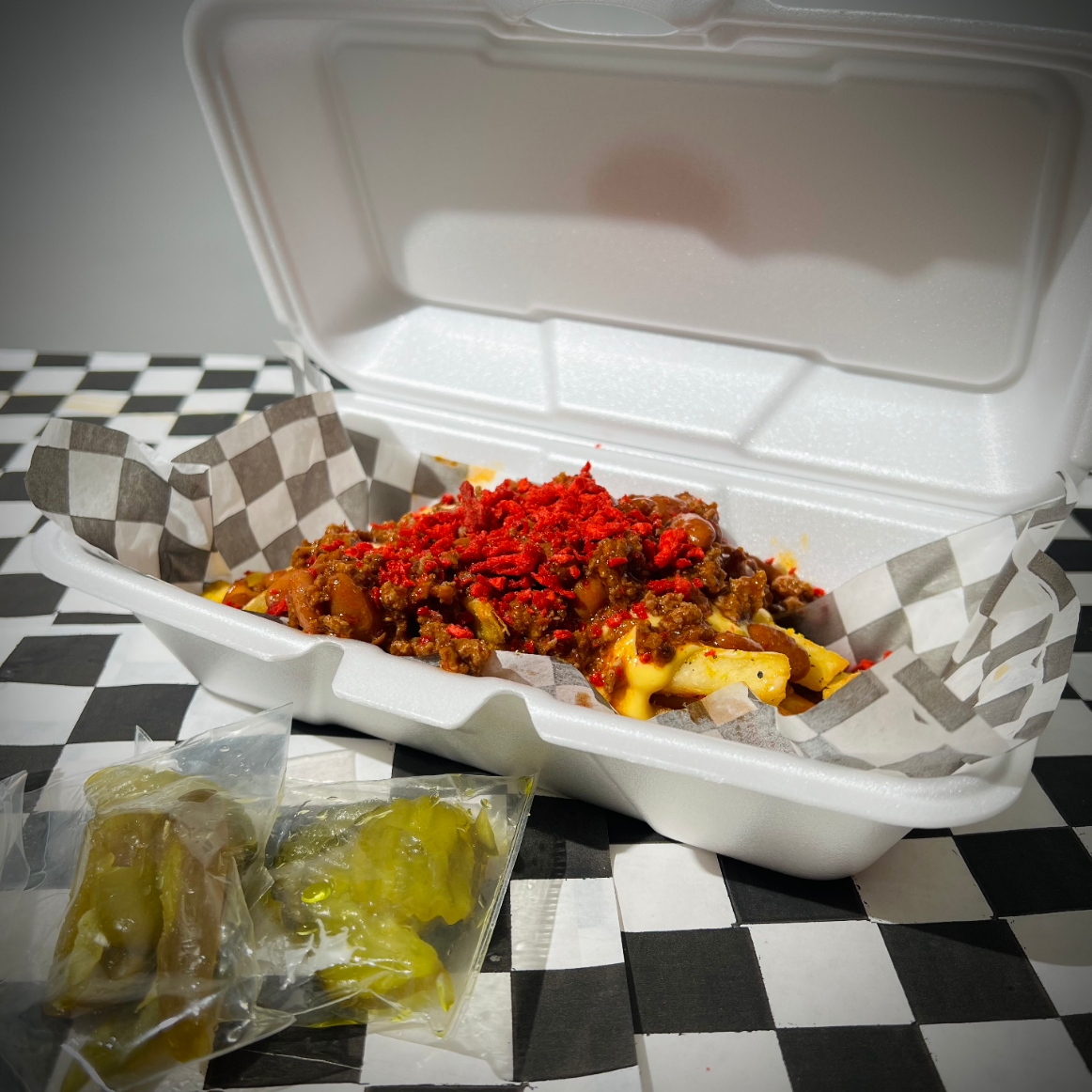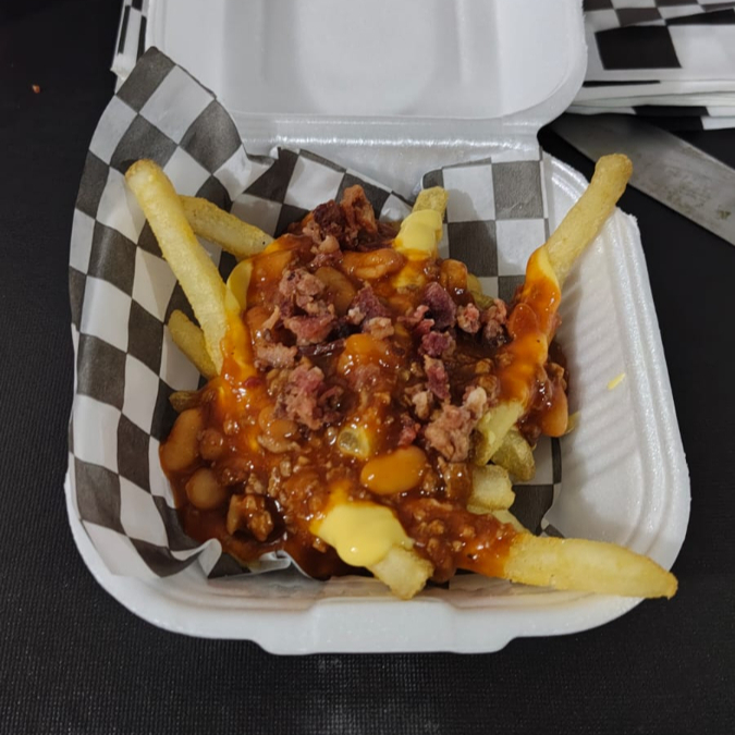 Papas fritas cargadas con queso amarillo, chili, tocino y jalapeño en porción chica.