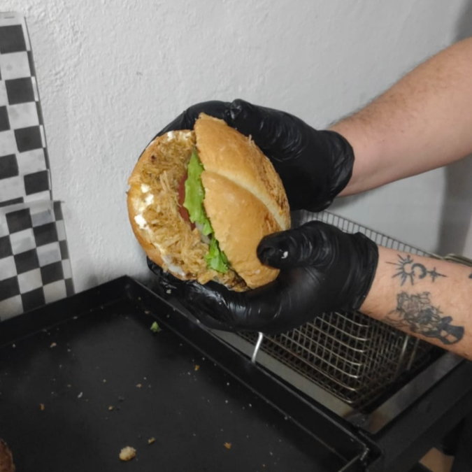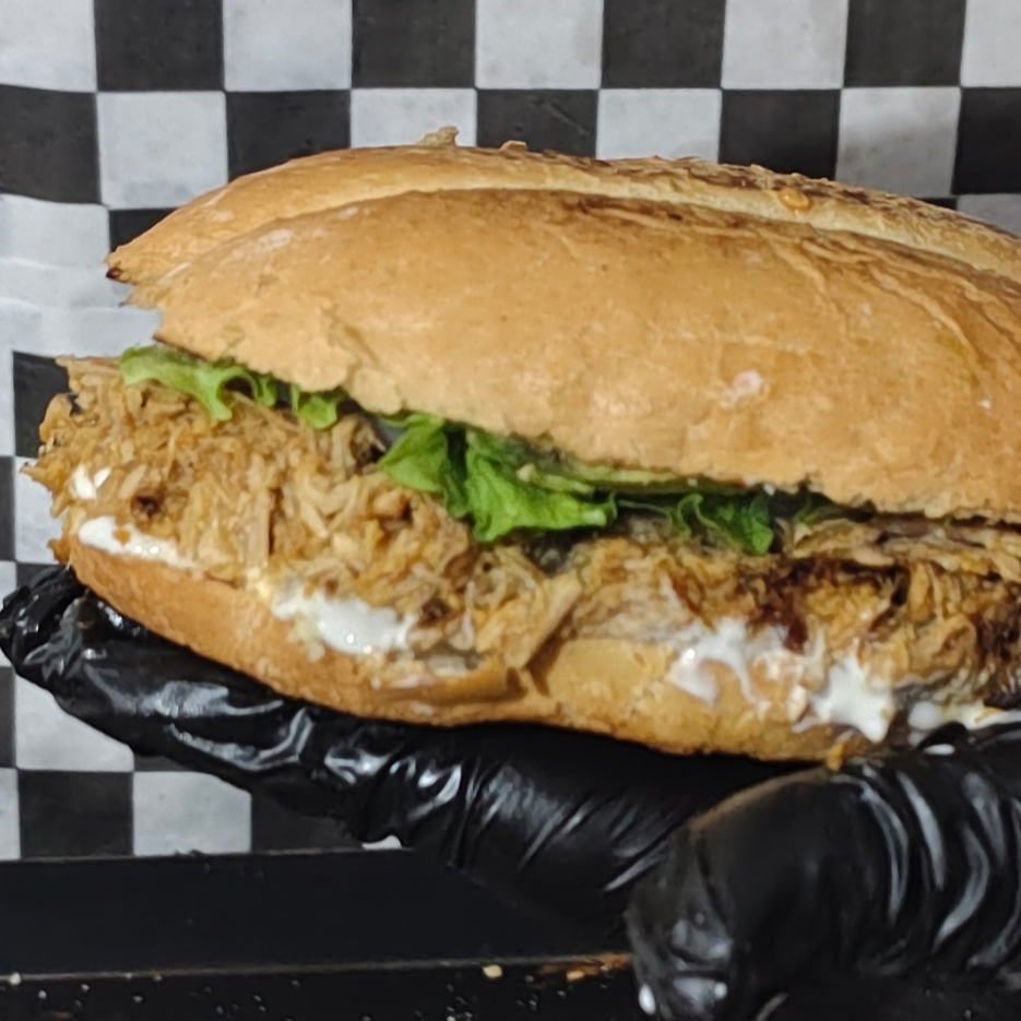 Torta artesanal con pan blanco, lechuga fresca, crema, tomate, cebolla morada y pierna horneada sazonada con receta especial de la casa.
