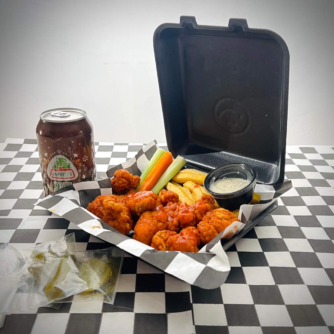 Crujientes boneless de pollo empanizados y bañados en salsa a elegir, acompañados de papas fritas y refresco. Perfectos para compartir y disfrutar en grupo.