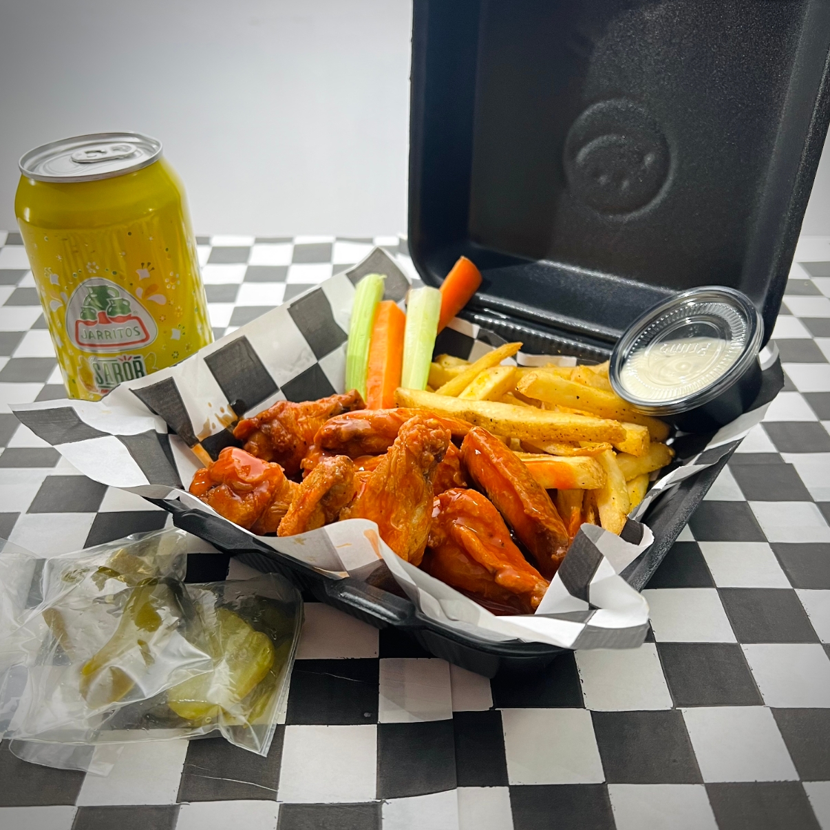 Alitas de pollo bañadas en salsa a elegir, perfectamente cocinadas y acompañadas de papas fritas y refresco.