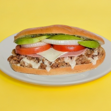 MILANESA EMPANIZADA, AGUACATE, JAMON, QUESO AMARILLO, TOMATE, CEBOLLA Y CREMA