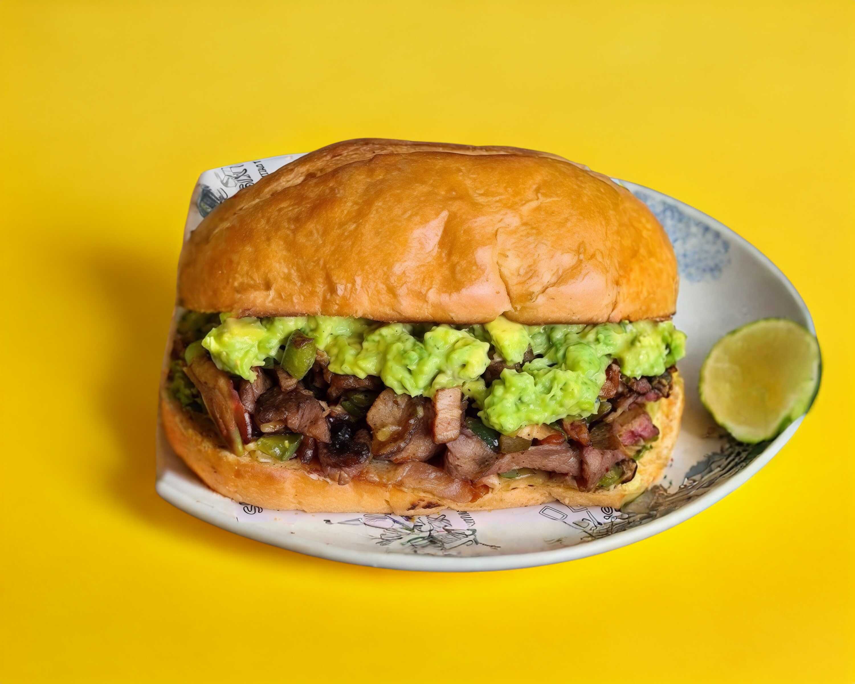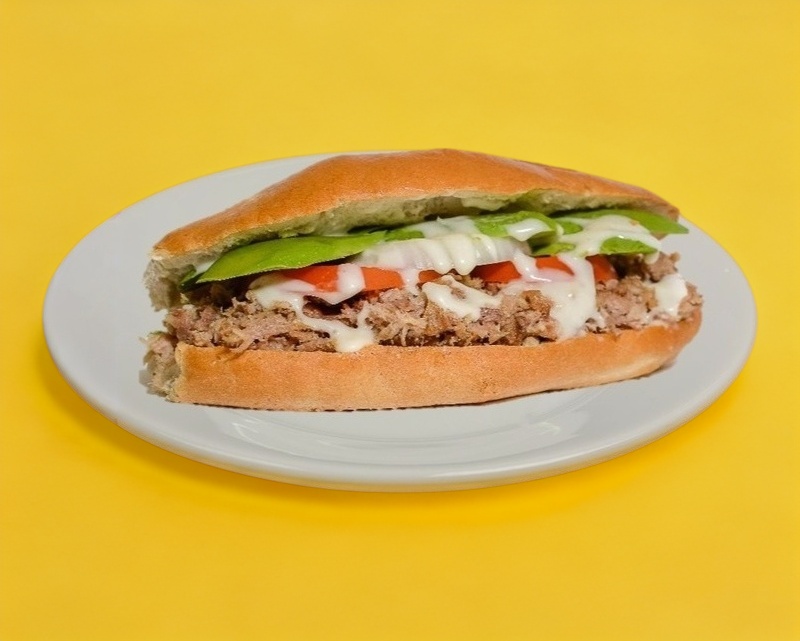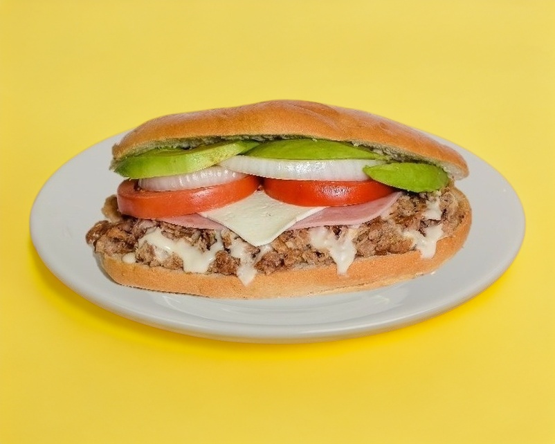Pierna de puerco, jamón, queso blanco, aguacate, tomate, cebolla y crema.