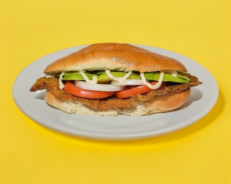 Milanesa empanizada, aguacate, tomate, cebolla y aderezo.