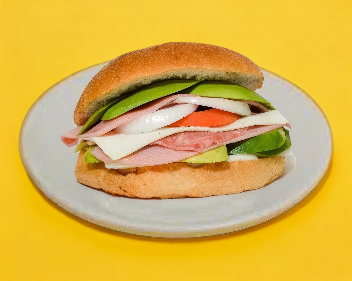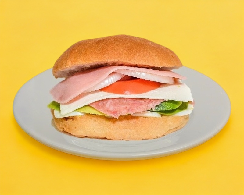 Huevo, doble aguacate, doble jamón, queso blanco, queso de puerco, tomate y cebolla.