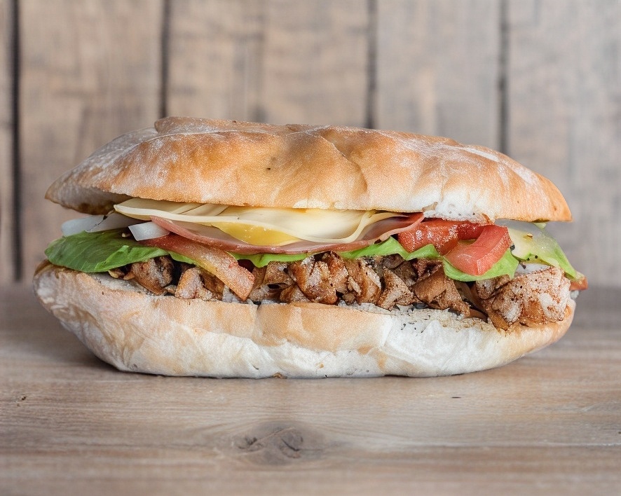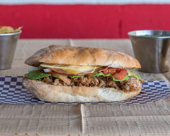 Pierna denpuerco bañada en salsa roja (picante) , aguacate, jamón, queso amarillo, queso blanco , tomates y cebolla