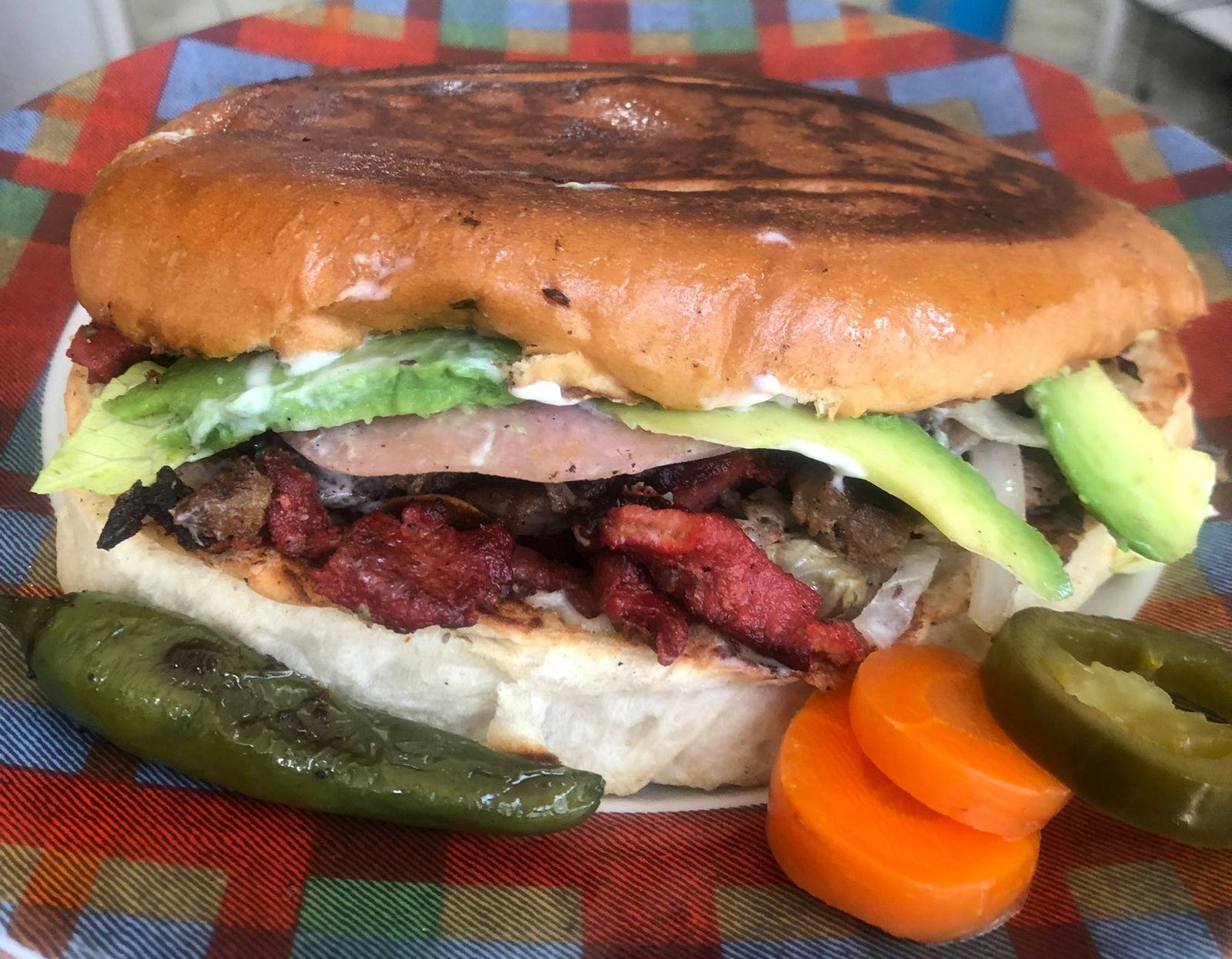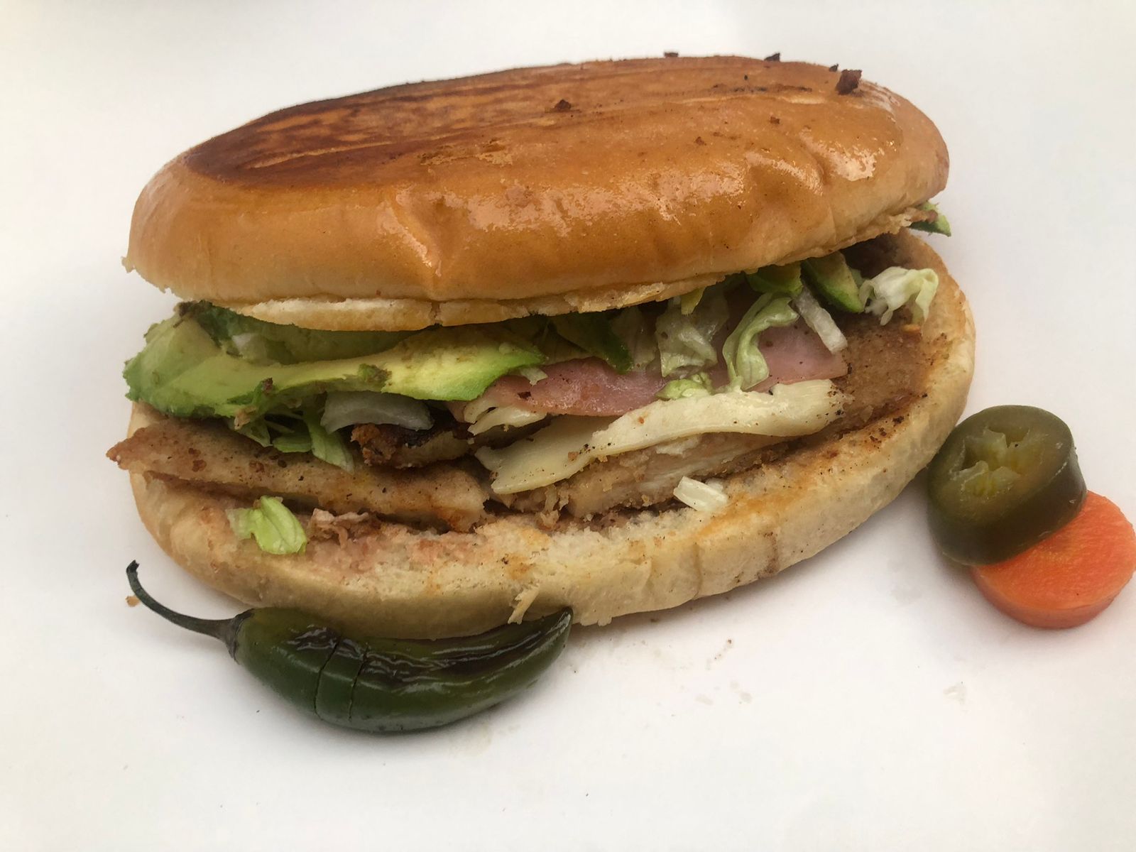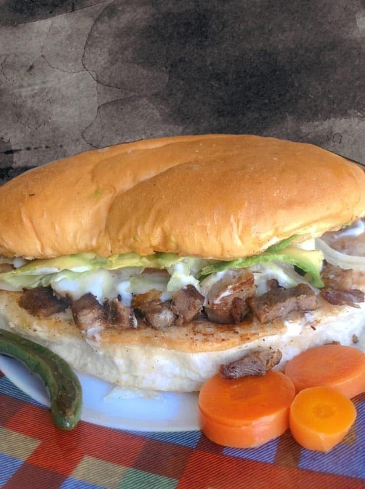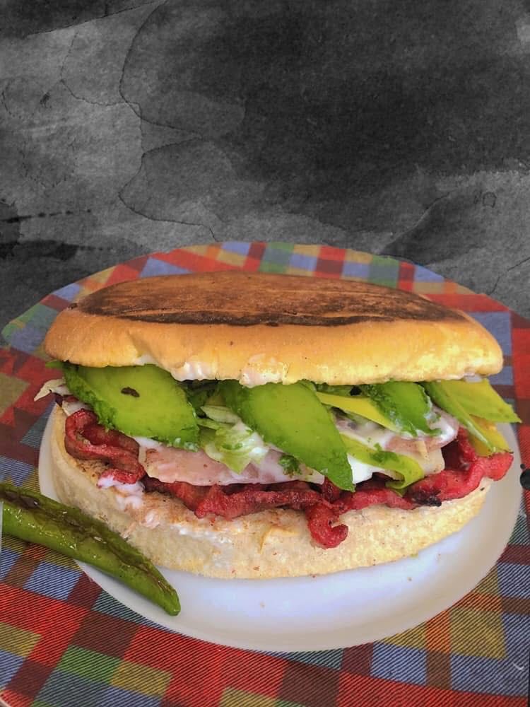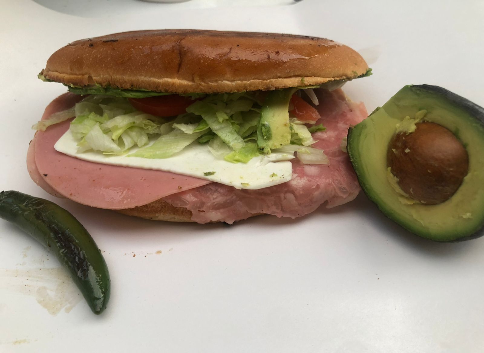 Jamón, mortadela, queso panela, queso de puerco, pastel pimiento, aguacate, lechuga, tomate, cebolla y mayonesa.