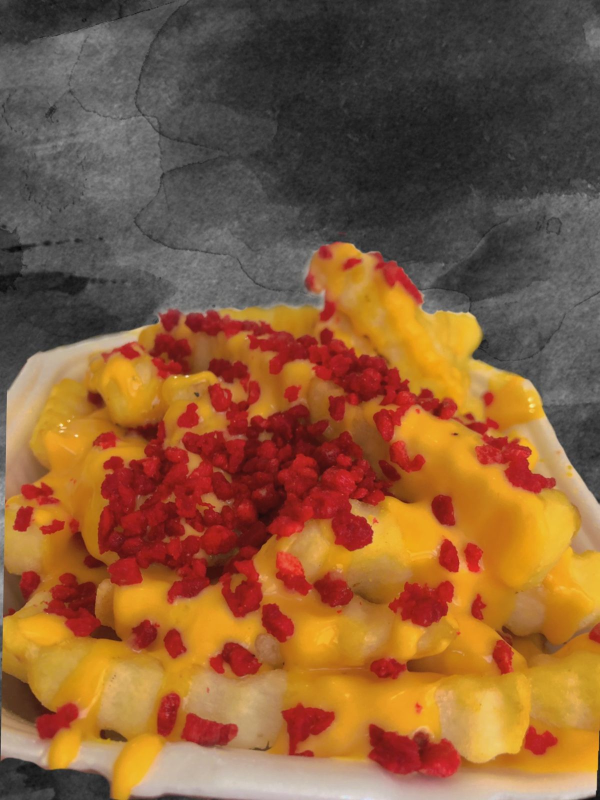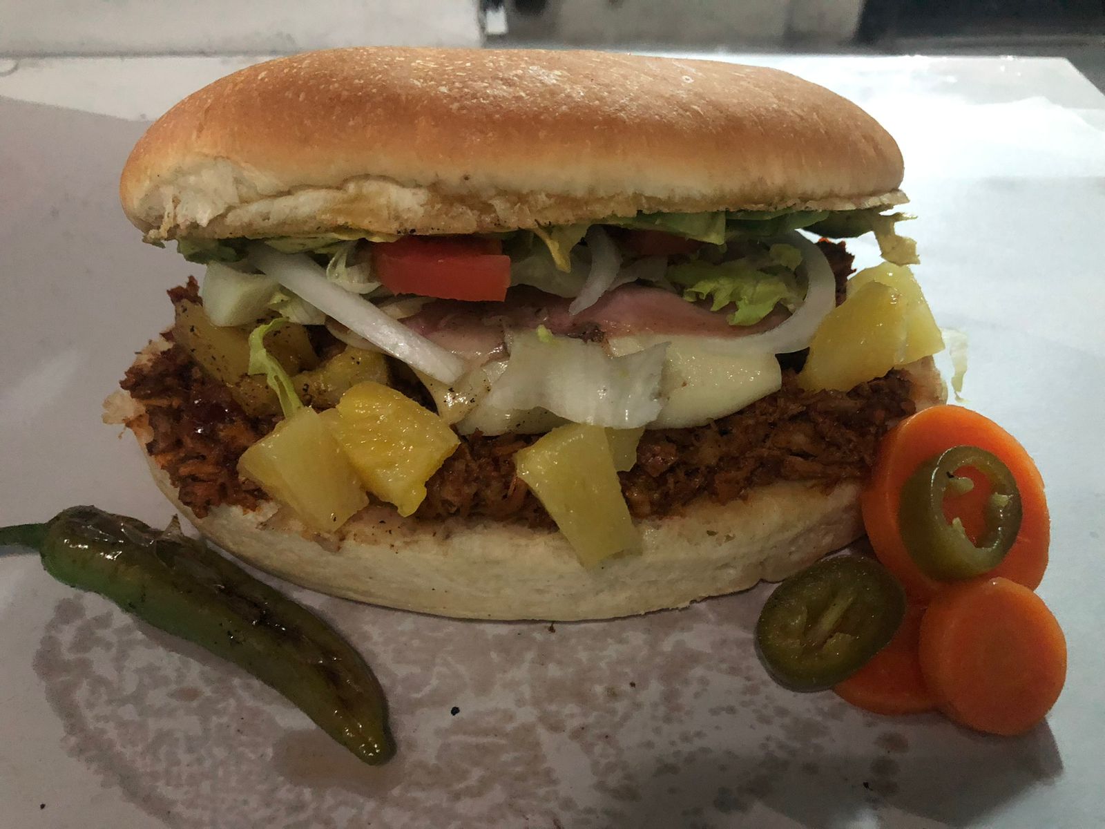 Pierna adobada, piña, crema aguacate, jamón, queso, frijoles refritos, lechuga, tomate, cebolla.