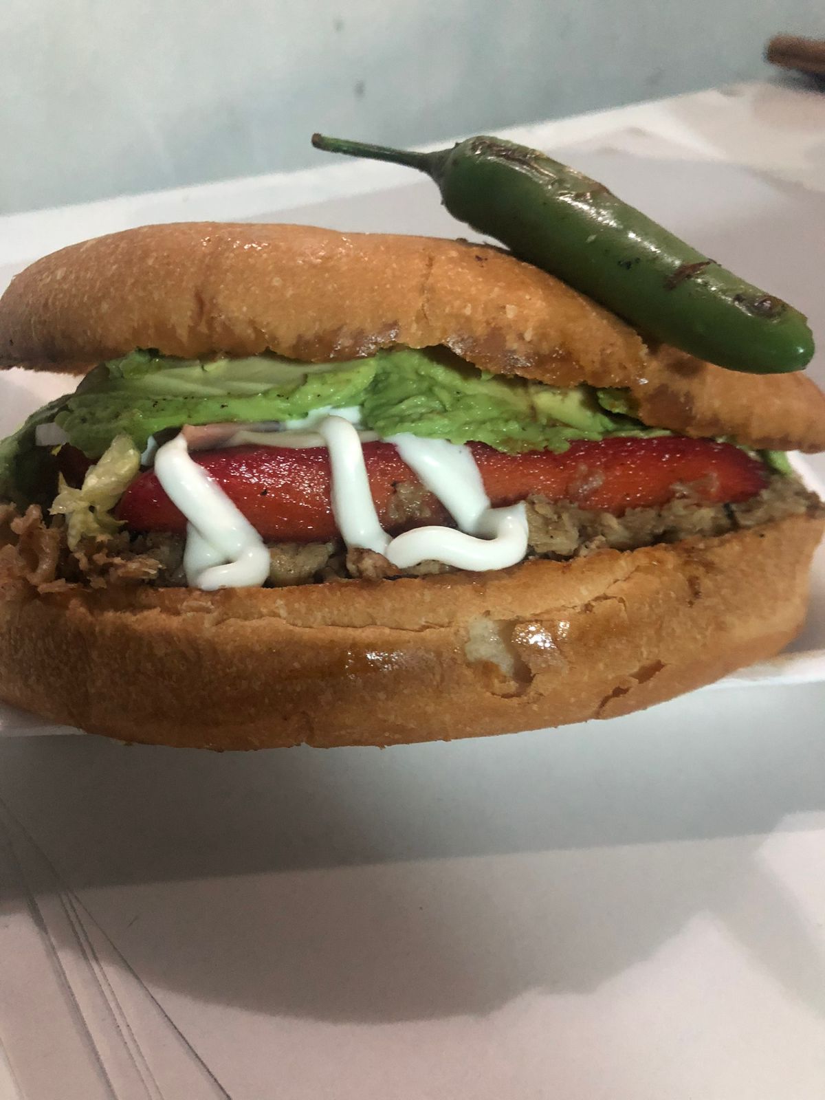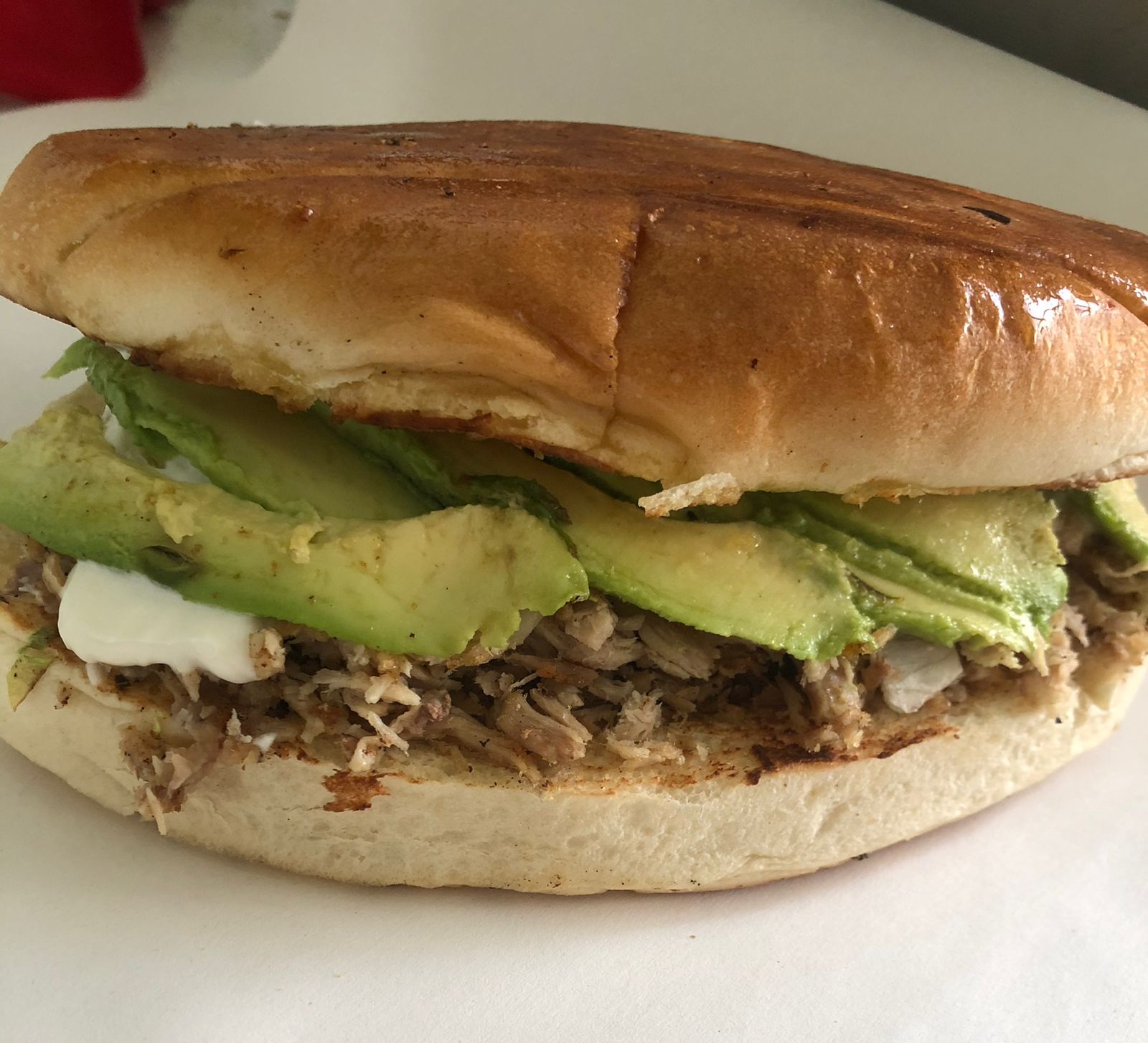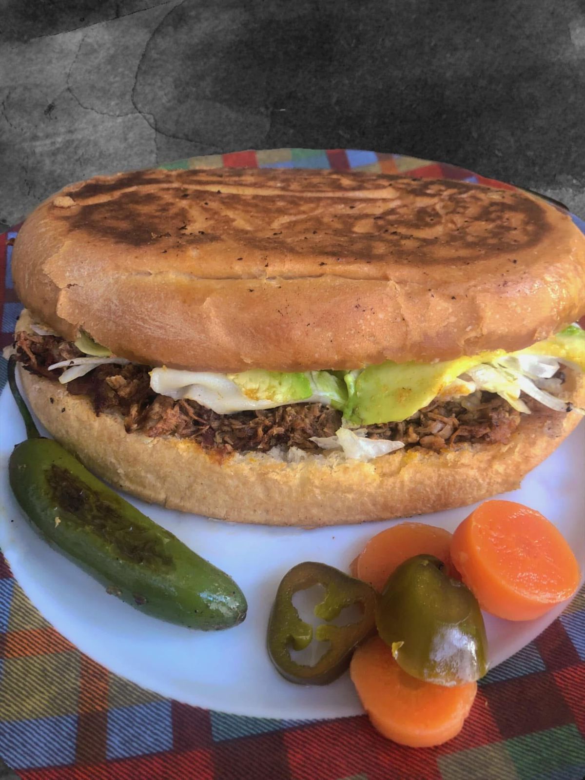 Pierna adobada, crema aguacate, jamón, queso, frijoles refritos, lechuga, tomate, cebolla.