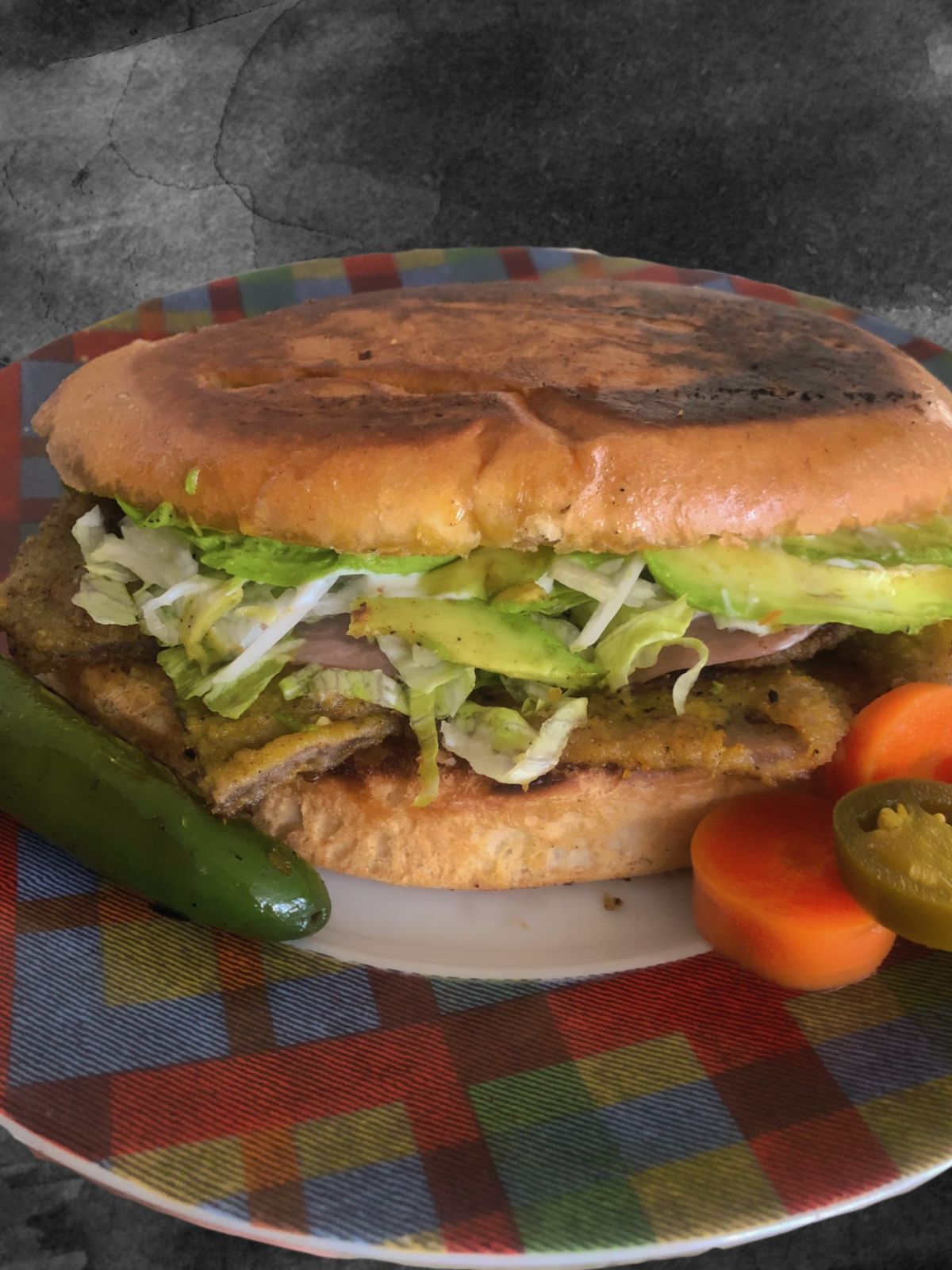 Milanesa de res empanizada, crema aguacate, jamón, queso, frijoles refritos, lechuga, tomate, cebolla.