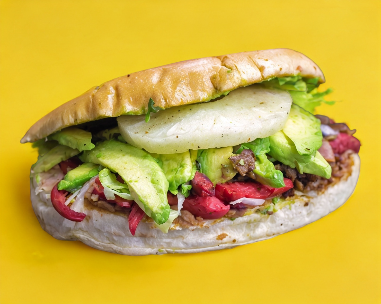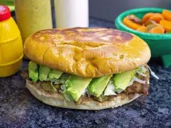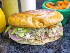 Mayonesa, lechuga, tomate, cebolla, queso, jamón y aguacate.