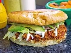 Milanesa de res con pollo empanizada (140 gramos), salchicha p/asar, frijoles refritos, crema, lechuga, cebolla adobada, tomate, aguacate, chile jalapeño y chile toreado.
