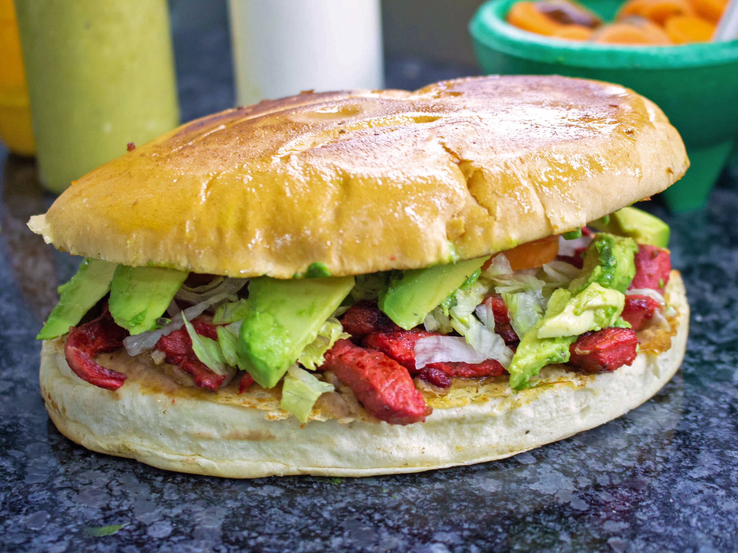 Milanesa, chorizo, frijoles refritos, crema, lechuga, cebolla, tomate y aguacate.