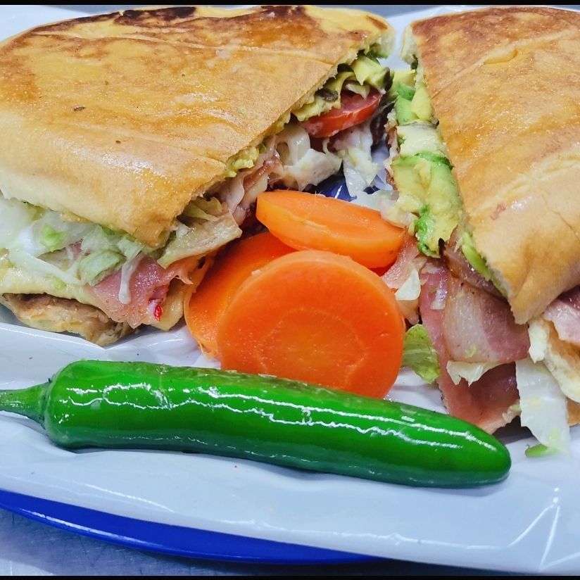 Mayonesa, jamón, lechuga, tomate, cebolla, jamon pimiento, queso de puerco, mortadela, queso panela y aguacate.