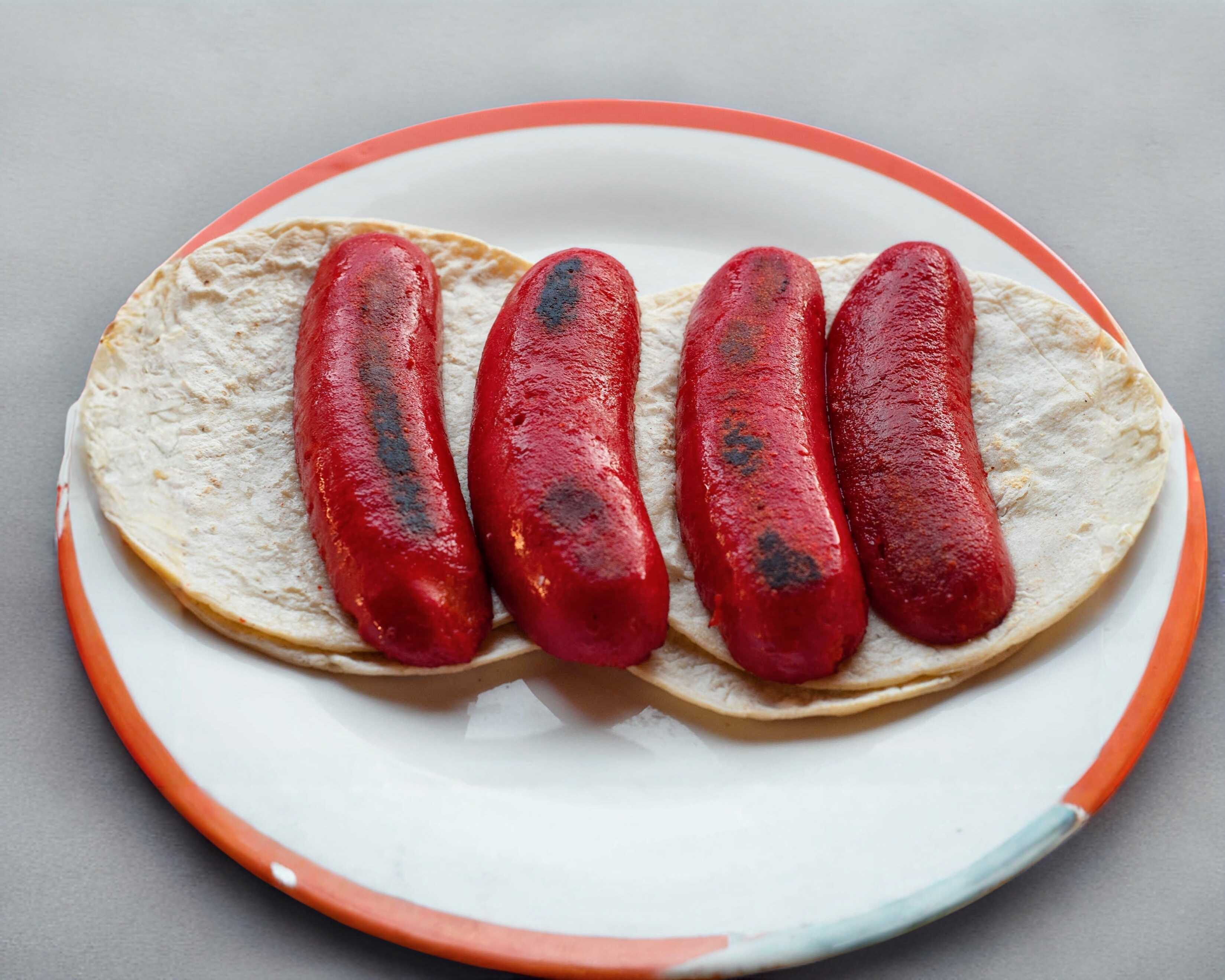 2 Salchichas asadas partidas a la mitad, acompañadas con tortillas y salsas.
