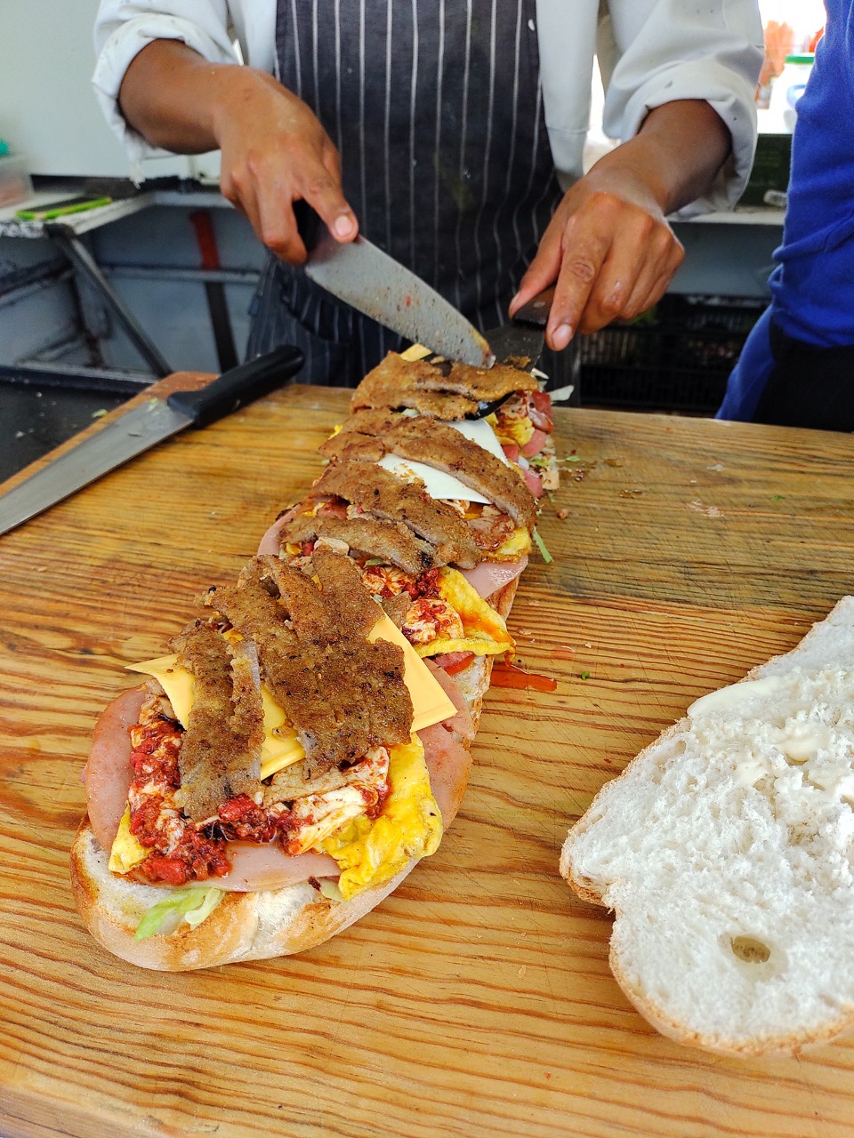 Deliciosa torta con milanesa, pierna, salchicha, huevo, jamon, queso blanco, amarillo, panela y de purco, asadero y chorizo.