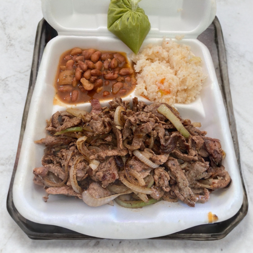 Delicioso platillo de bisteck a la mexicana con tortillas y un complemento.