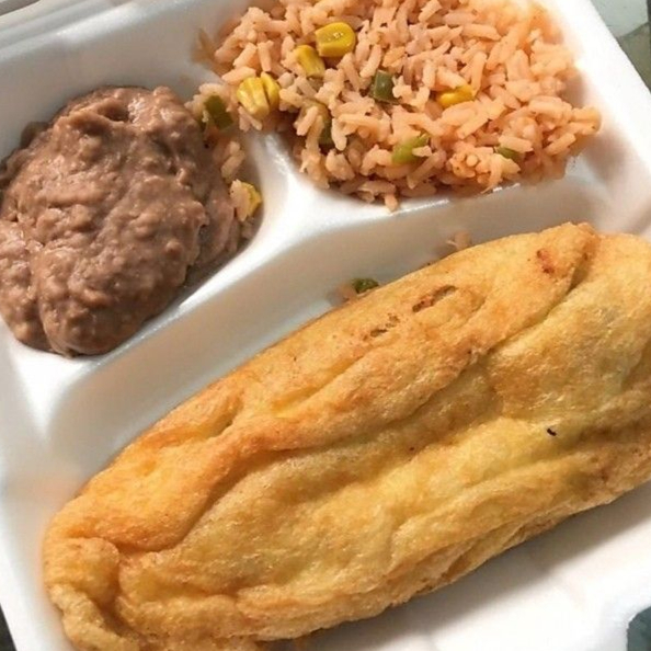 TORTILLA ROJA ENVUELTA CON QUESO PANELA, ACOMPAÑADAS CON PAPAS, ZANAHORIA, ARROZ Y VERDURA