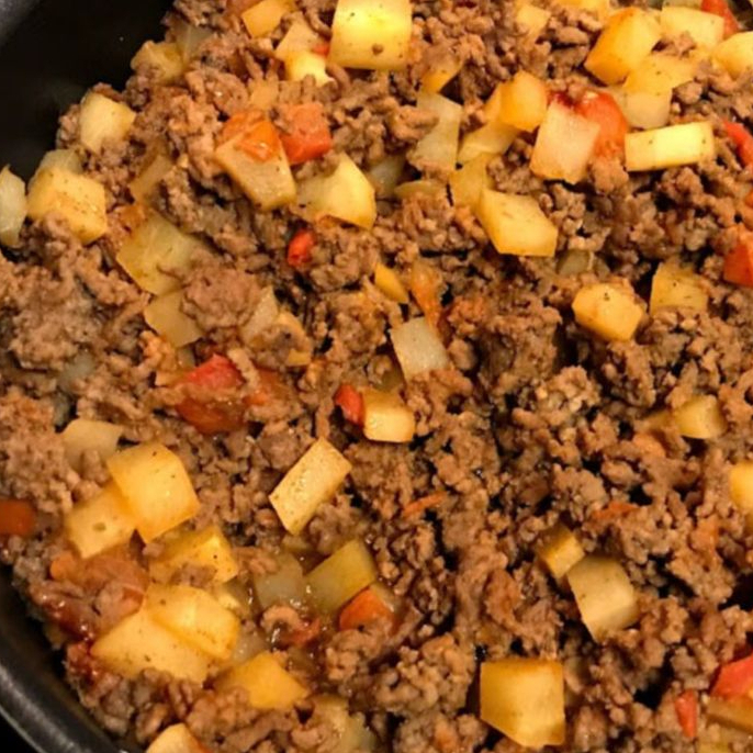CARNE MOLIDA GUISADA CON PAPA PIMIENTO ACOMPAÑADO CON ARROZ Y FRIJOLES