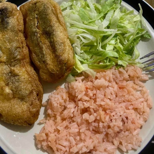 3 CHILITOS JALAPEÑOS RELLENOS DE QUESO O PICADILLO, ACOMPAÑADO DE ARROZ, FRIJOL Y PORCION DE ENSALADA.