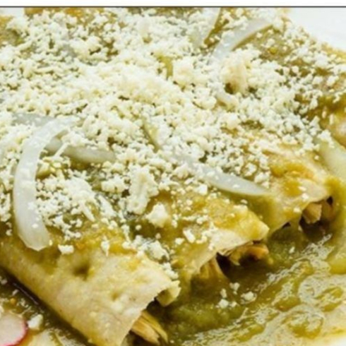 TORTILLA ENVUELTA CON POLLO, BAÑADA CON SALSA VERDE, QUESO MANCHEGO, ACOMPAÑADO CON ARROZ Y FRIJOLES