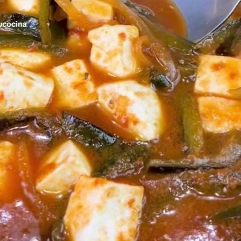 QUESO PANELA GUISADO CON SALSA NO PICOSA, RAJAS POBLANAS, ACOMPAÑADO DE ARROZ Y FRIJOLES