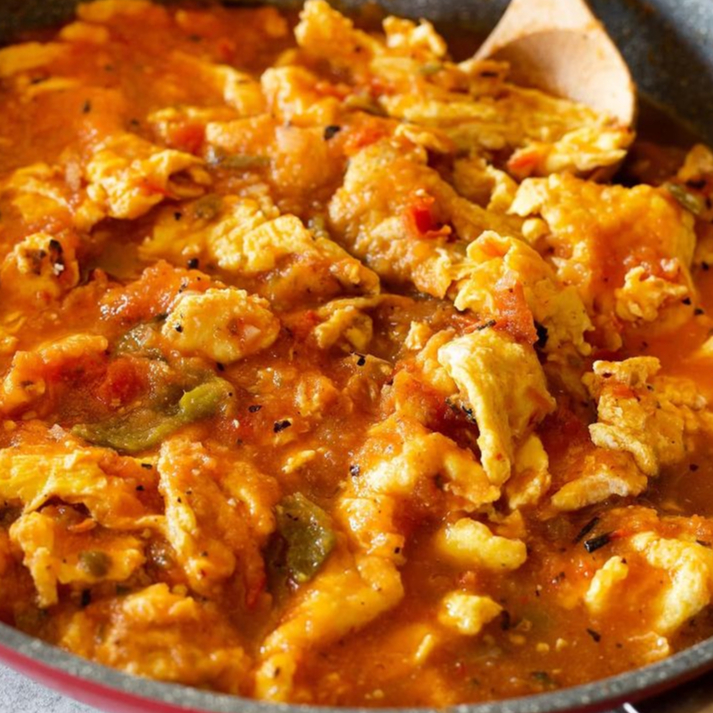 2 HUEVOS REVUELTOS EN SALSA ROJA CASERA, ACOMPAÑADO CON FRIJOL REFRITO, QUESO PANELA Y TORTILLAS.