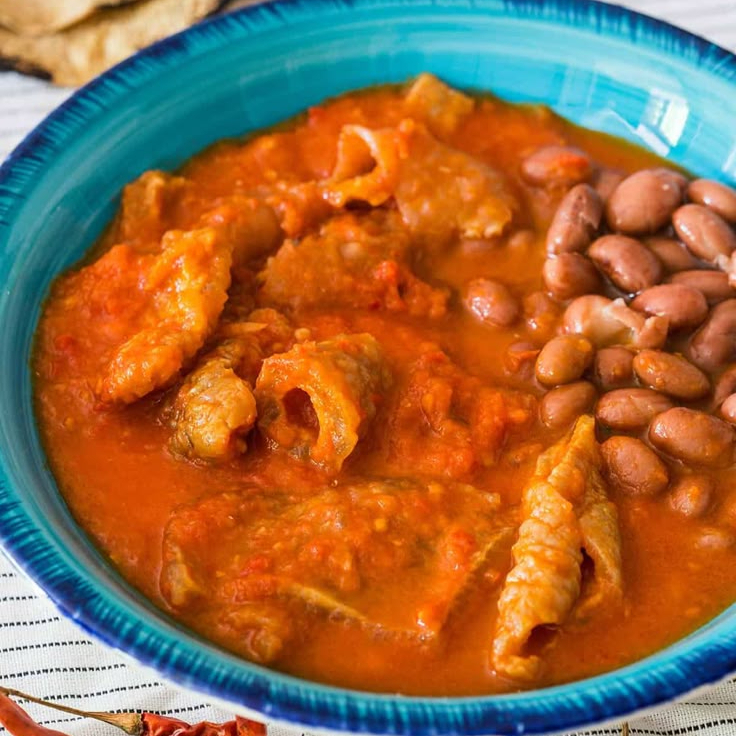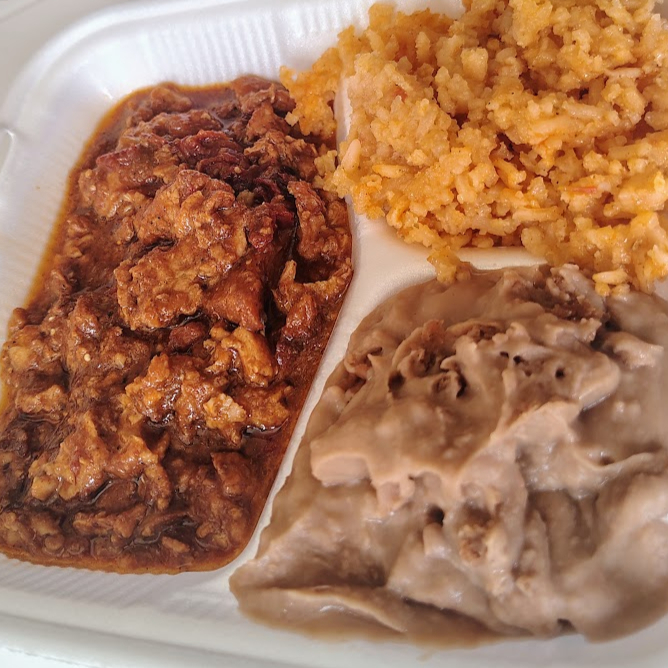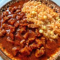 CHICHARRON DE CACHETE GUISADO EN SALSA DE CHILE MORITA ACOMPAÑADO CON ARROZ Y FRIJOLES