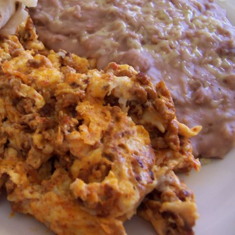 2 HUEVOS REVUELTO CON CHORIZO, ACOMPAÑADO CON FRIJOLES REFRITOS, QUESO PANELA Y TORTILLAS