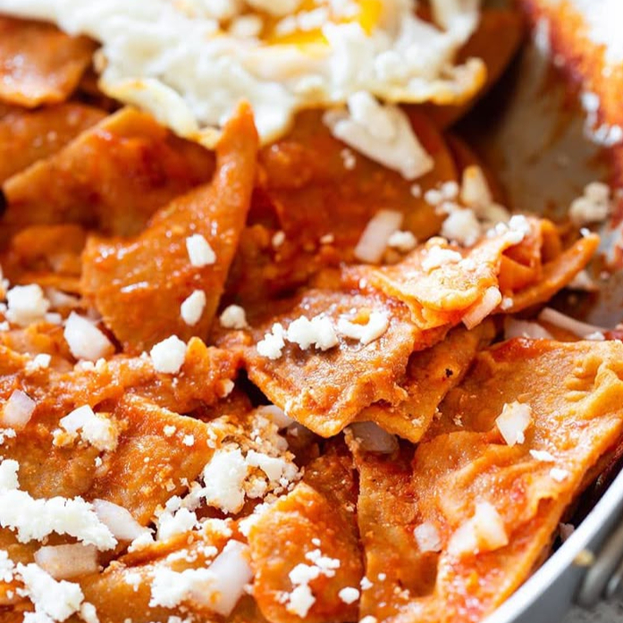 .CHILAQUILES EN SALSA ROJA ACOMPAÑADOS SEGUN SU ELECCION HUEVO, POLLO O CHICHARRON EN SALSA ROJA