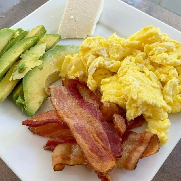 HUEVO ESTRELLADO O REVUELTO ACOMPAÑADO CON TOCINO, AGUACATE Y QUESO PANELA