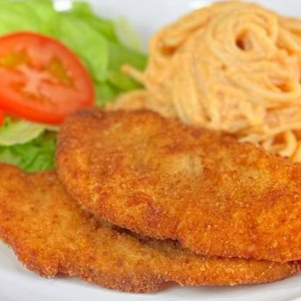 MILANESA DE POLLO EMPANIZADA ACOMPAÑADO DE SPAGETTI Y ENSALADA