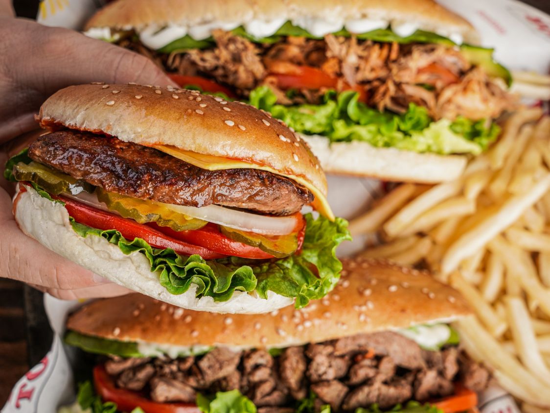 Hamburguesas de carne de res, acompañada de lechuga, tomate, cebolla, pepinillos, queso amarillo y aderezo de la casa