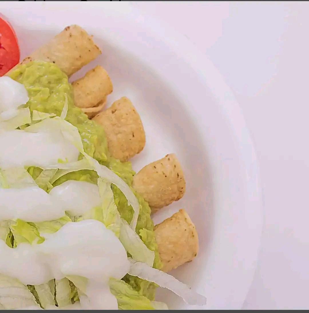 5 envoltorios de pollo dorados, lechuga, guacamole y crema.