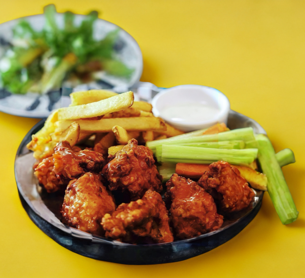 380gr alitas bañadas en salsa bbq/chipotle, 75gr papas, apio, zanahoria, aderezo