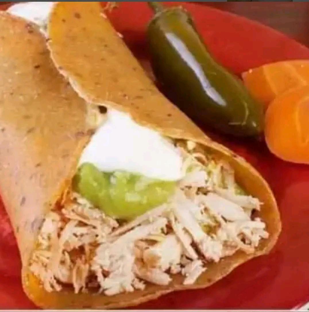 Tortilla de maíz ( 1 pieza) , pollo deshebrado ( un puñado) , guacamole, chile y crema.